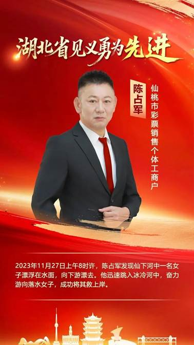 11月28日,湖北省见义勇为英雄先进表彰大会隆重举行,来自仙桃市的体彩代销者陈占军,因在冰冷河水中勇救落水者的义举,被授予“湖北省见义勇为先进”称号。