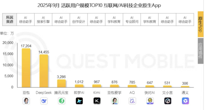 近日,根据多个媒体的报道,豆包的日活用户已经突破1亿人次,并且成为字节史上推广费用最少的DAU破亿产品。而根据Questmobile8月、9月的数据,豆包的月活跃规模已经稳居AI综合助手产品的第一位。