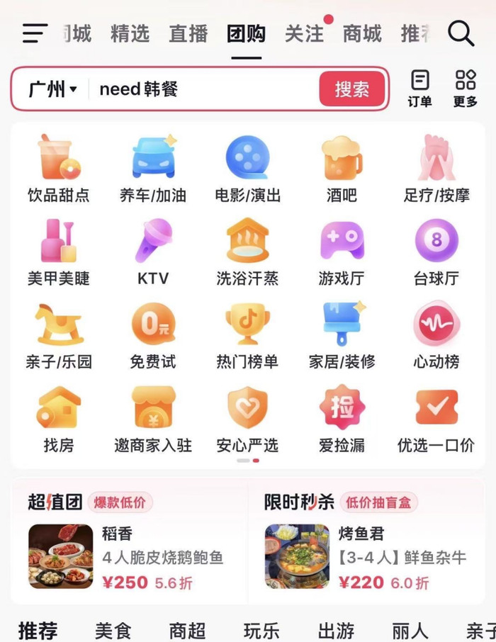 本地生活里,抖音也在“偷家”。根据第三方机构的估算,抖音生活服务今年的GTV预计超过8000亿,进一步逼近美团的GTV规模。除了餐饮酒旅,抖音目前团购类目中还有洗浴、台球、家居装修等泛行业,而且团购入口就在抖音的关注和直播中间,流量方面的支撑十分明显。