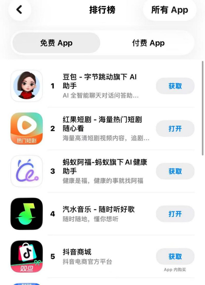 苹果中国区免费应用榜单前十名中,字节系占了五位,目前榜单的第一名是豆包。
