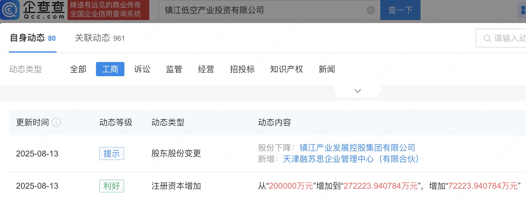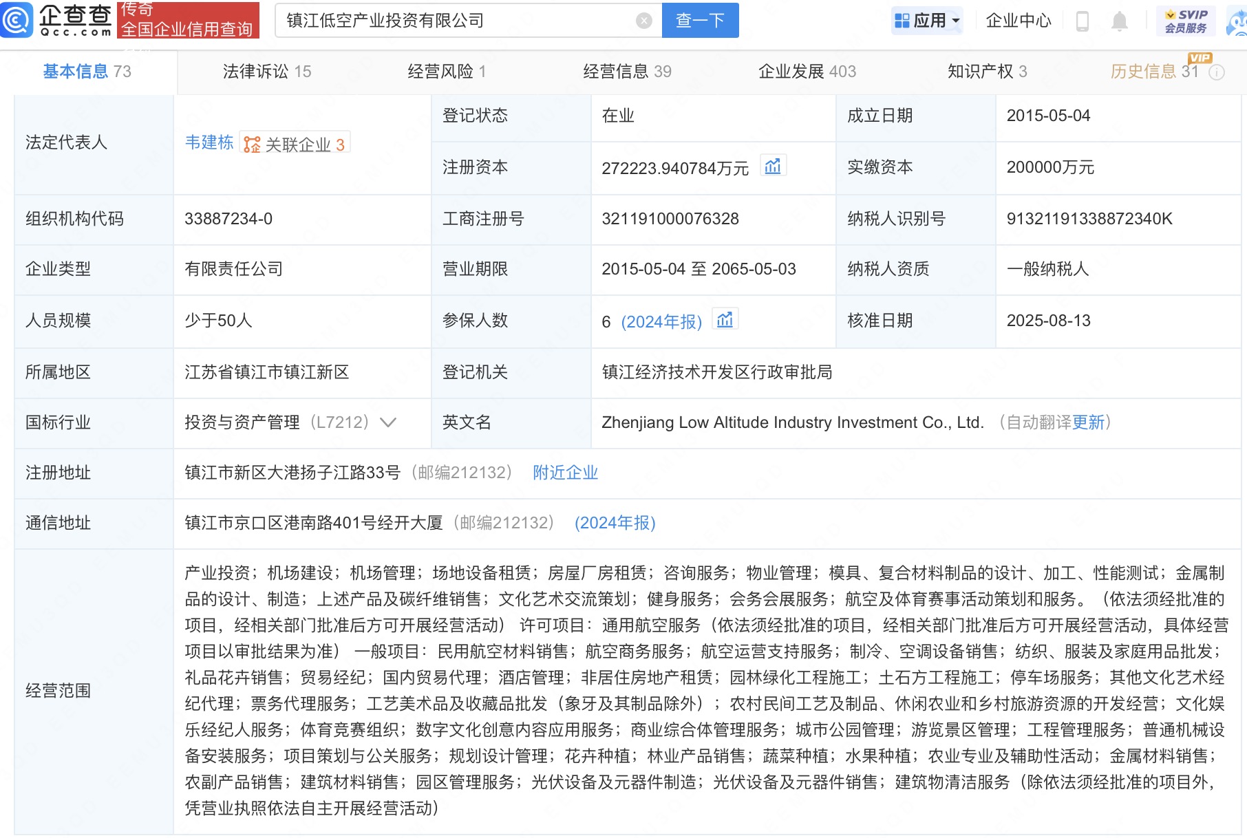 近日,镇江低空产业投资有限公司发生工商变更,新增天津融苏思企业管理中心(有限合伙)为股东,同时,注册资本由20亿人民币增至约27.2亿人民币。企查查信息显示,该公司成立于2015年,法定代表人为韦建栋,经营范围含民用航空材料销售、航空商务服务、航空运营支持服务等。