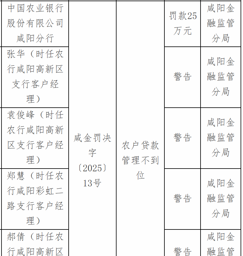 1月14日,国家金融监督管理总局咸阳监管分局行政处罚信息公示表显示,中国农业银行股份有限公司咸阳分行因农户贷款管理不到位被罚款25万元。责任人张某、袁某峰、郑某、郝某、赵某被警告。
